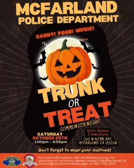 To make this Trunk or Treat & Community Night Out possible, the McFarland Police Department is seeking participation from local businesses and organizations. Benefits include free participation, advertising, and a chance to interact with the community in a safe environment. Submit your registration by Friday, October 17th, 2025.