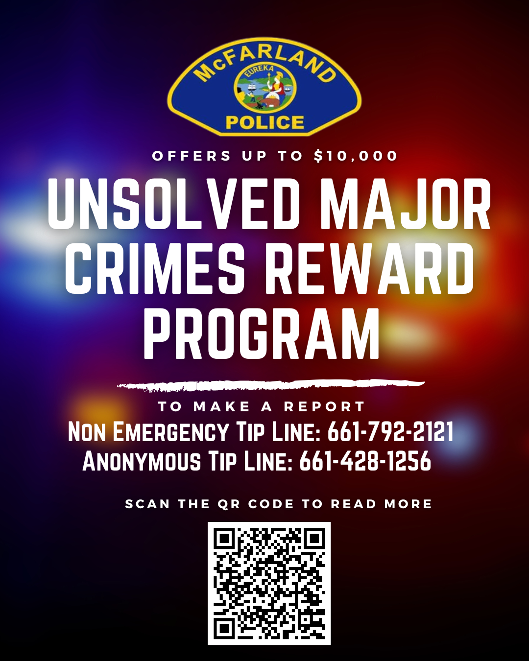 The City of McFarland believes in the power of community engagement in solving crimes. We regularly update this section with any new information, case developments, or community announcements related to the Unsolved Major Crimes Reward Program.