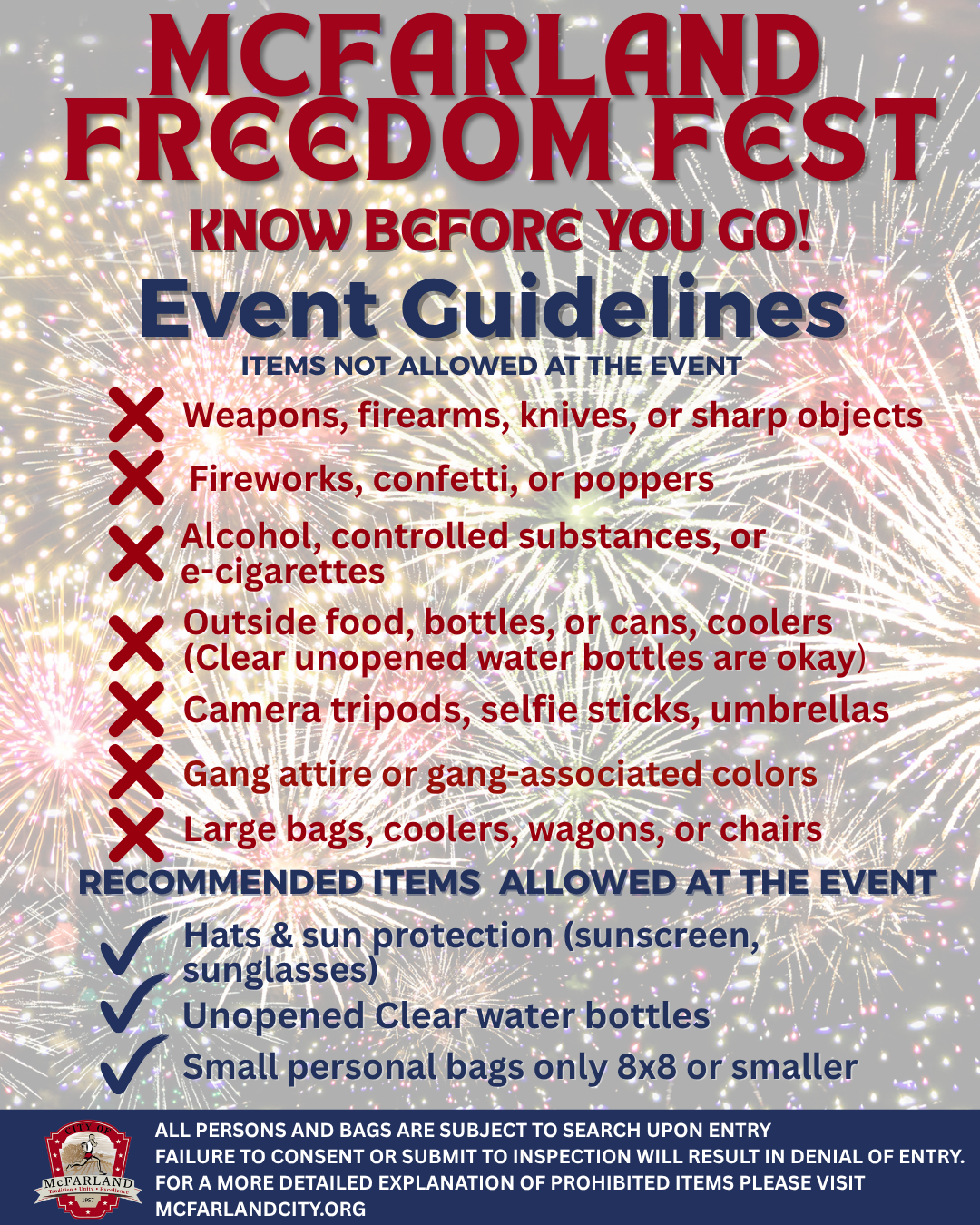 All guests must go through bag checks and metal detectors before entering. The event follows a first-come, first-served seating model and saving seats is not allowed, so please arrive with your entire party. The McFarland Police Department will coordinate public safety with additional support from professional security and allied agencies. A cooling station will be available to help guests stay comfortable.