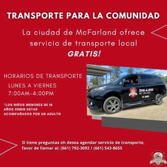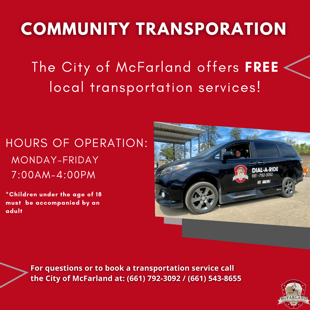 For Questions or to book a transportation service call The City of McFarland at 661-792-3092 / 661-543-8665